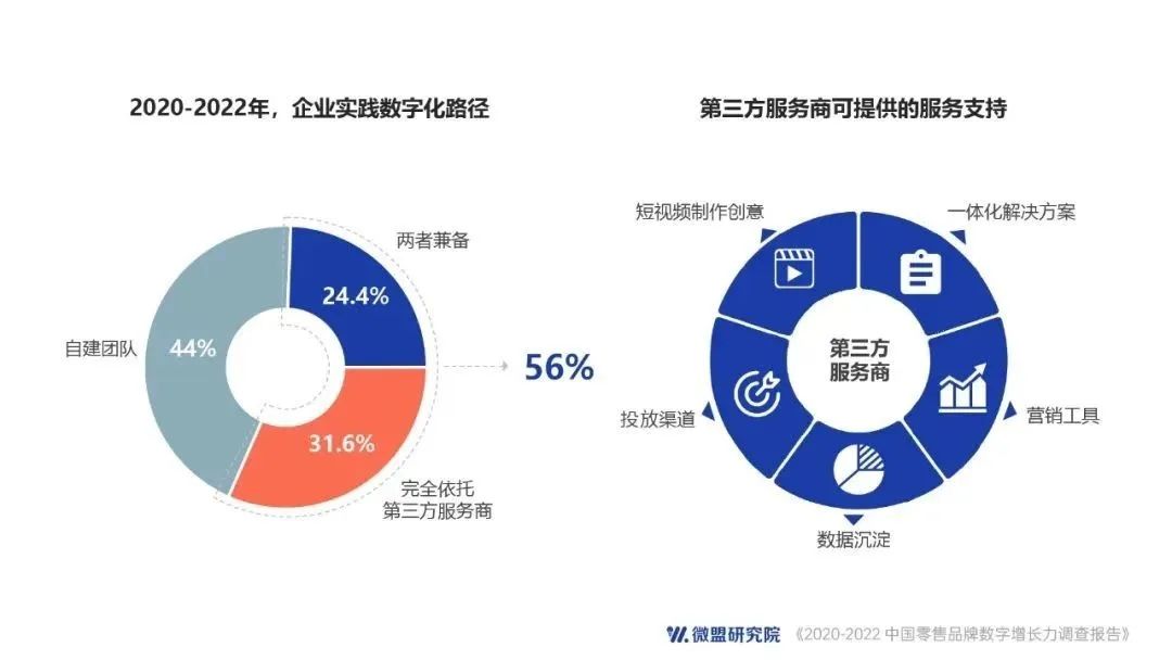 《報告》顯示,過去三年里,31.6%的企業選擇完全依靠第三方SaaS服務商來推進數字化進程,24.4%的企業選擇第三方SaaS服務商和自有IT技術團隊兩者結合推動數字化。SaaS服務商通過不斷的技術創新為零售企業構建增量場景已經成為數字化轉型中的一個重要環節。