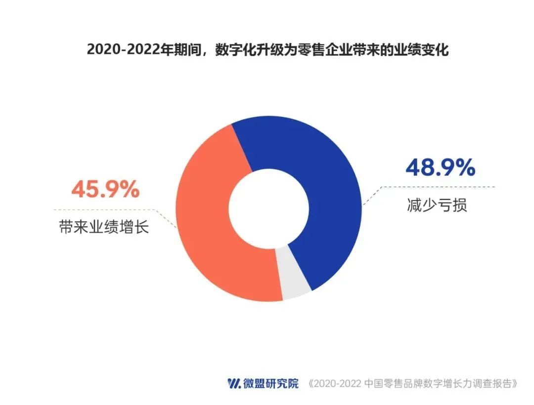 調查顯示,從2020年到2022年,65.8%的受訪企業選擇以數字化手段來應對經營困境,48.9%的受訪企業表示數字化為企業減少了虧損,45.9%的受訪企業表示完成數字化升級后為業績帶來增長。總體而言,超九成受訪企業表示完成數字化升級后為業績帶來了正面影響。