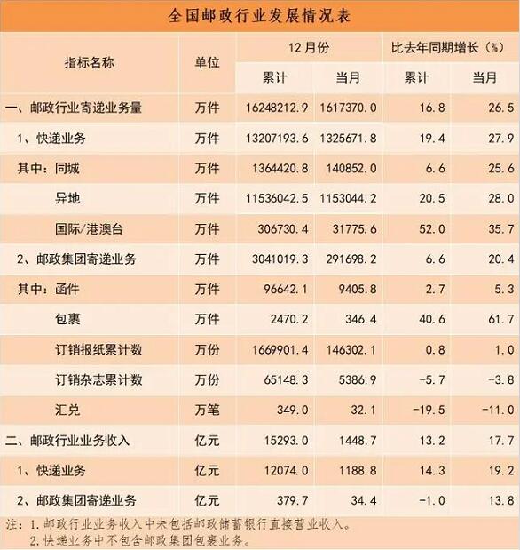 國家郵政局官方微信22日公布2023年郵政行業(yè)運行情況,2023年,郵政行業(yè)寄遞業(yè)務量累計完成1624.8億件,同比增長16.8%。其中,快遞業(yè)務量(不包含郵政集團包裹業(yè)務)累計完成1320.7億件,同比增長19.4%。