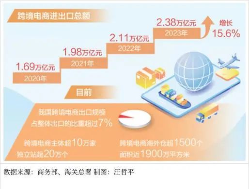 據(jù)海關(guān)測算,2023年,我國跨境電商進(jìn)出口總額2.38萬億元,增長15.6%。其中,出口1.83萬億元,增長19.6%;進(jìn)口5483億元,增長3.9%??缇畴娚炭焖侔l(fā)展,既滿足了國內(nèi)消費者多樣化個性化需求,又助力我國產(chǎn)品通達(dá)全球,成為外貿(mào)發(fā)展的重要動能。