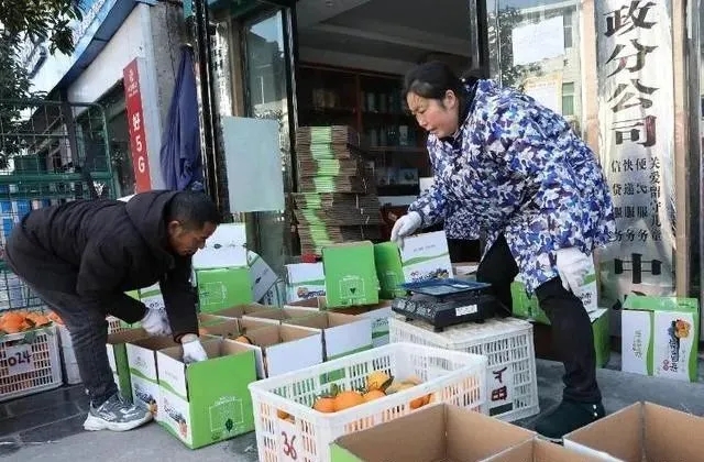 湖南湘西郵政農(nóng)村電商便民服務(wù)站,工作人員在為果農(nóng)包裝柑橘準(zhǔn)備銷售。