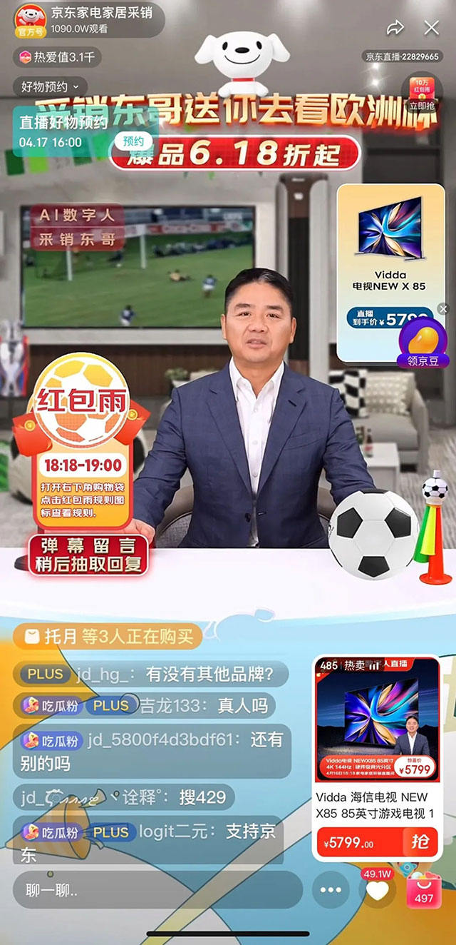 在直播間,“采銷東哥AI數字人”談笑自若,講起自己在運動、烹飪方面的心得,還對直播帶貨的大屏電視、一日三餐的健康搭配滔滔不絕,“東哥”專業、熱情的講解,贏得了網友的好評。