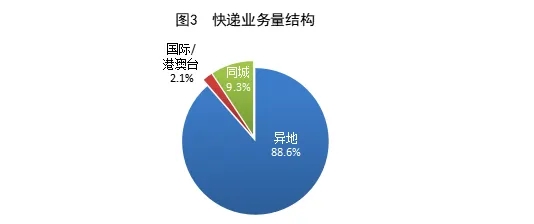 1-4月,同城、異地、國際/港澳臺快遞業務量分別占全部快遞業務量的9.3%、88.6%和2.1%。與去年同期相比,同城快遞業務量的比重下降0.2個百分點,異地快遞業務量的比重上升0.2個百分點,國際/港澳臺業務量的比重基本持平。