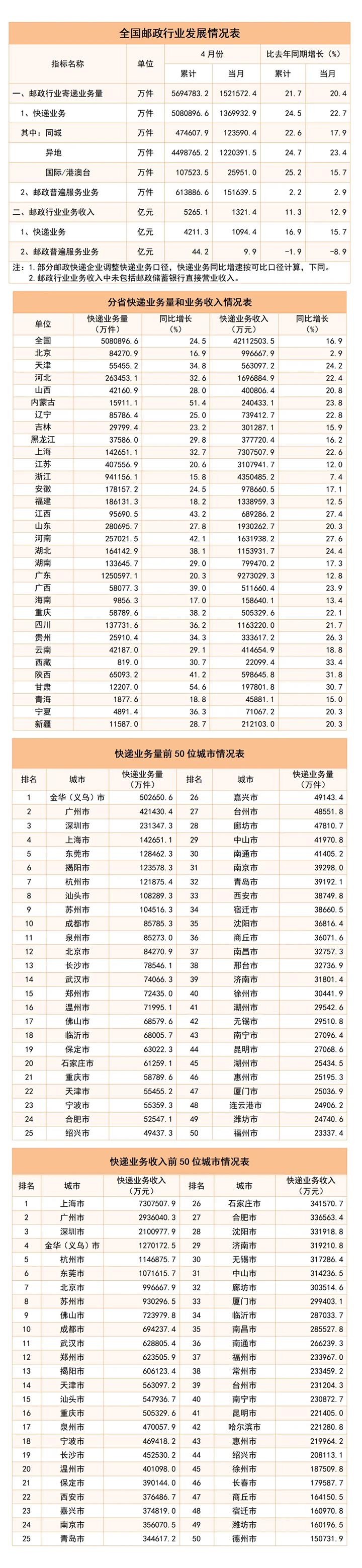4月份,郵政行業寄遞業務量完成152.2億件,同比增長20.4%。其中,快遞業務量完成137.0億件,同比增長22.7%。