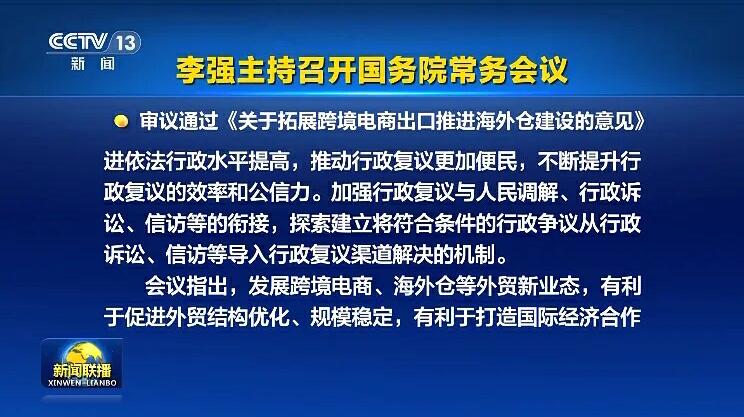 國(guó)務(wù)院總理李強(qiáng)5月24日主持召開國(guó)務(wù)院常務(wù)會(huì)議,聽取關(guān)于行政復(fù)議工作情況的匯報(bào),審議通過(guò)《關(guān)于拓展跨境電商出口推進(jìn)海外倉(cāng)建設(shè)的意見》。
