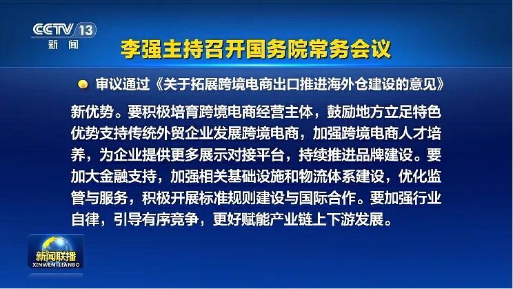 媒體報(bào)道李強(qiáng)主持召開國(guó)務(wù)院常務(wù)會(huì)議 審議通過(guò)《關(guān)于拓展跨境電商出口推進(jìn)海外倉(cāng)建設(shè)的意見》