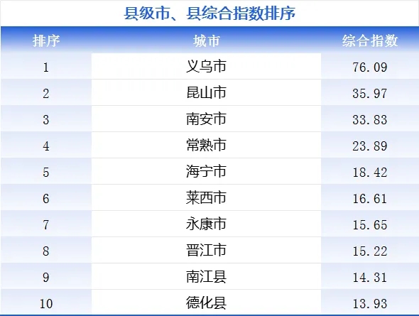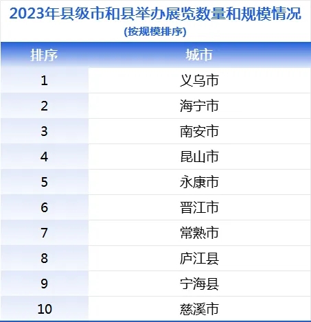中國會展經濟研究會線上發布的《2023年中國展覽數據統計報告》(以下簡稱《報告》)顯示,2023年,義烏會展綜合實力以絕對優勢位列全國縣級市首位。排名前五名的分別為義烏、昆山、南安、常熟、海寧。