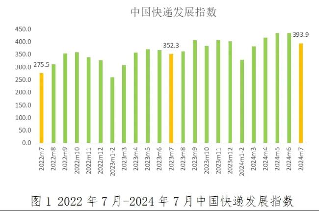經測算,2024年7月中國快遞發展指數為393.9,同比提升11.8%。其中發展規模指數、服務質量指數和發展能力指數分別為508.8、564.7、218.6,同比分別提升31.1%、0.7%、7.3%,發展趨勢指數為62.5。7月,快遞業保持穩中向好發展態勢,智能裝備加快應用,跨境服務繼續優化,發展效能穩步提升。
