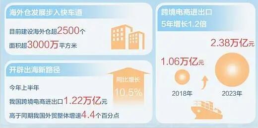 如今,分散在全球各地的海外倉連點成線、織線成網,跨越山海開辟出海新路徑。海關總署發布的最新數據顯示,今年上半年,我國跨境電商進出口1.22萬億元,同比增長10.5%,高于同期我國外貿整體增速4.4個百分點。從2018年的1.06萬億元,到2023年的2.38萬億元,5年間,我國跨境電商進出口增長了1.2倍。