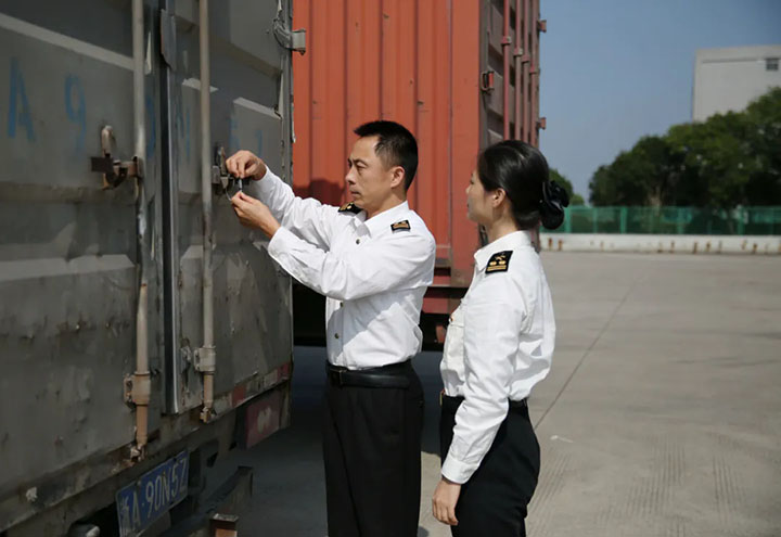 10月24日,在浙江嘉善跨境電商海關監管中心內,杭州海關所屬嘉興海關的兩名海關關員對當日監管的3.02萬個包裹所在集裝箱施加關鎖,隨后這批跨境電商零售出口跨關區轉關貨物由嘉興轉至上海,經浦東機場海關辦理現場貨物核銷手續后,搭乘當晚航班出口。