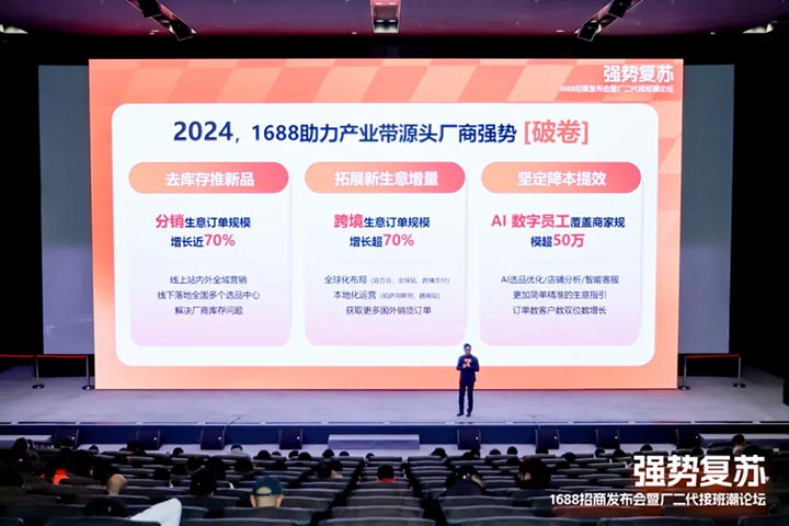 近日從阿里巴巴旗下源頭廠貨直供直銷平臺(tái)1688獲悉,2024年1688平臺(tái)跨境生意訂單規(guī)模同比增長超70%,2025年1688將進(jìn)入海外15個(gè)國家和地區(qū)。