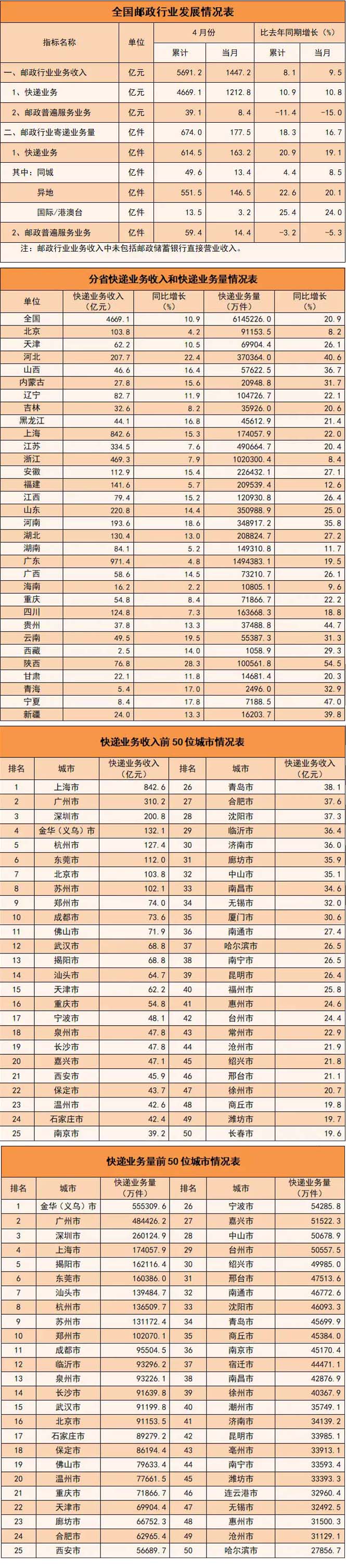 4月份,郵政行業(yè)業(yè)務(wù)收入(不包括郵政儲蓄銀行直接營業(yè)收入)完成1447.2億元,同比增長9.5%。其中,快遞業(yè)務(wù)收入完成1212.8億元,同比增長10.8%。