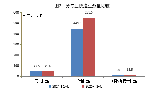 1—4月,同城快遞業(yè)務(wù)量累計完成49.6億件,同比增長4.4%;異地快遞業(yè)務(wù)量累計完成551.5億件,同比增長22.6%;國際/港澳臺快遞業(yè)務(wù)量累計完成13.5億件,同比增長25.4%。