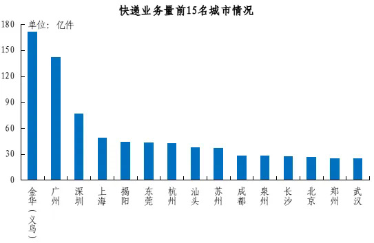 快遞業務收入排名前十五位的城市依次是上海、廣州、深圳、金華(義烏)、杭州、東莞、北京、蘇州、佛山、成都、鄭州、武漢、揭陽、汕頭和天津,其快遞業務收入合計占全部快遞業務收入的比重達到52.8%。
