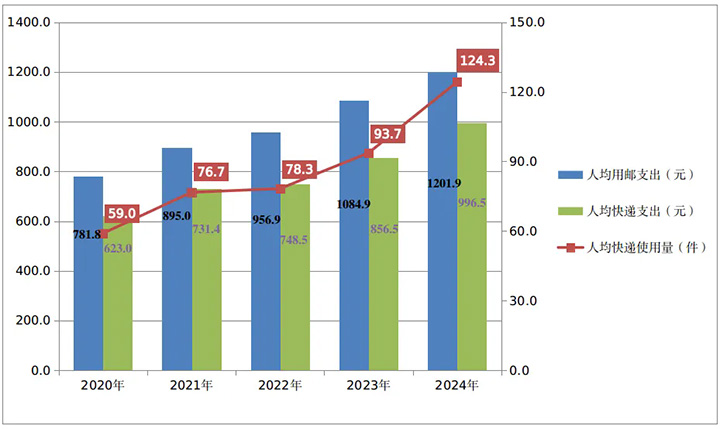 2020-2024年人均用郵支出、快遞支出和快遞使用量情況