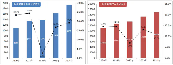 2024年郵政行業寄遞業務量完成1936.8億件,同比增長19.2%。其中,快遞業務量完成1750.8億件,同比增長21.5%。
